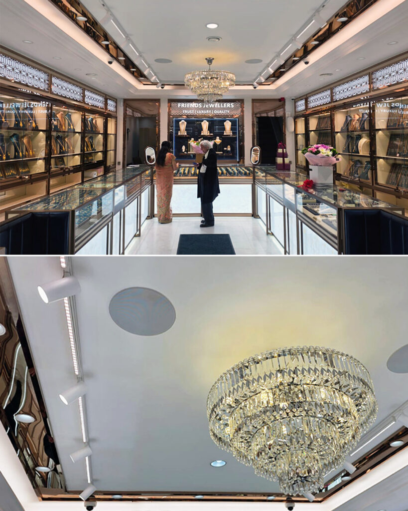 We are delighted to showcase the impact of our 48V Mag Track System at Friends Jewellers in Birmingham. This advanced lighting solution, fully colour‑adjustable and dimmable, allows jewellers to select the exact illumination needed to highlight the unique character of each piece. The result is a store environment where craftsmanship shines, and customers experience jewellery in its truest brilliance.